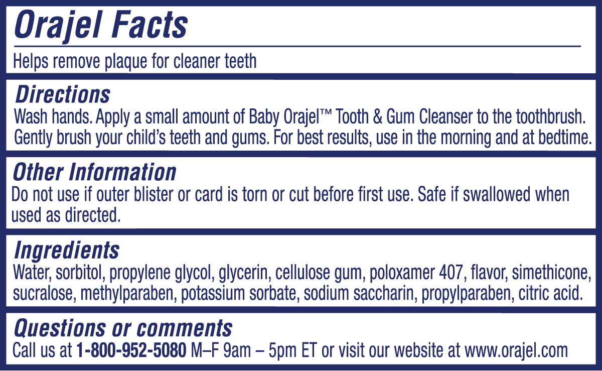 Aplica una pequeña cantidad de Baby Orajel™ Limpieza de Dientes y Encías al Cepillo de Dientes. Luego, con movimientos circulares, cepilla suavemente los dientes y las encías.
